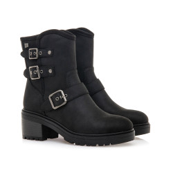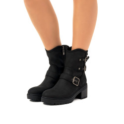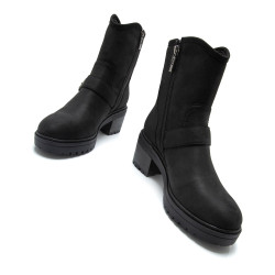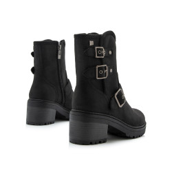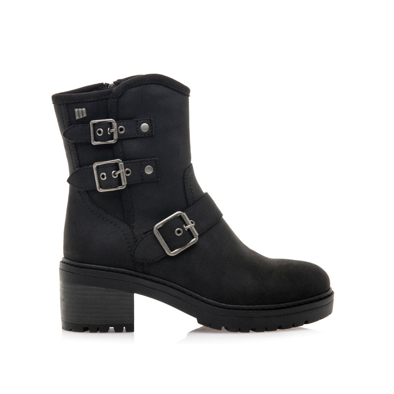 Botines de estilo biker de color negro para mujer, modelo Doris de Mtng. Este diseño incorpora caña media y tres hebillas metálicas decorativas que refuerzan su estética boho. La suela con relieve y el tacón ancho aportan estabilidad y comodidad en cada paso, mientras que la cremallera lateral facilita el calce. Su acabado negro mate la convierte en una opción versátil para looks urbanos o más desenfadados durante los meses fríos.