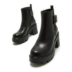 Botines negros de tacón para mujer de la marca Mtng, modelo Emeline. Este diseño combina un tacón ancho con una plataforma robusta, ideal para aportar altura y comodidad. Detallados con una hebilla negra decorativa en el lateral y paneles elásticos que facilitan el ajuste. Perfectos para complementar looks casuales o urbanos, estos botines son una opción funcional y con carácter para cualquier ocasión. Fabricado con un 60% de algodón reciclado post consumo y un 40% de algodón convencional.