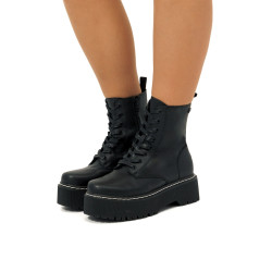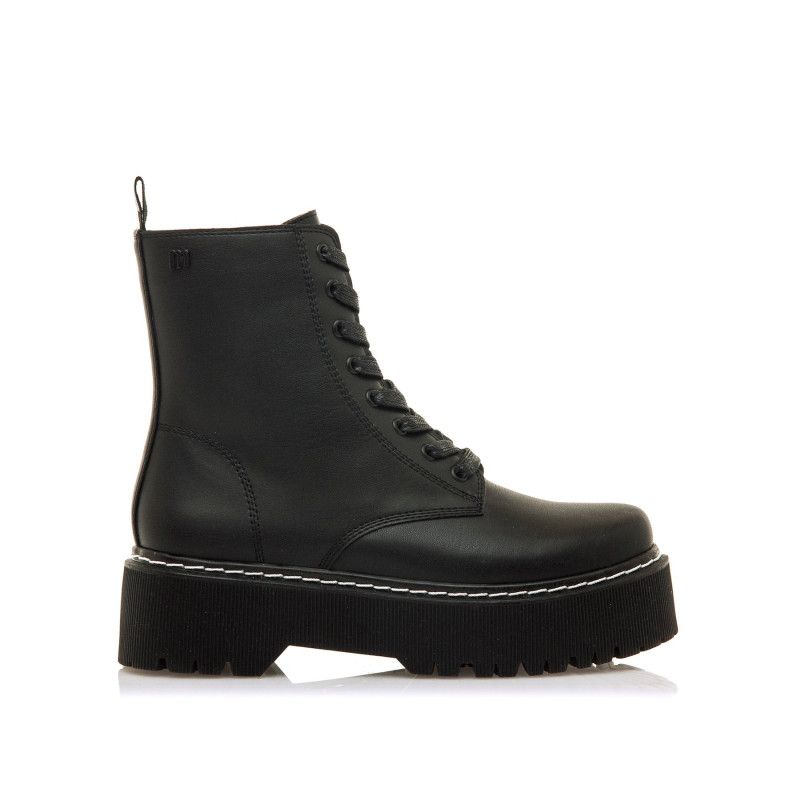 Botín estilo militar de color negro de la marca Mtng para mujer, modelo Storm. Su caña media y diseño con cordones aportan un toque urbano ideal para looks casuales. La suela dentada de plataforma asegura mayor comodidad y un extra de altura, mientras que la costura decorativa en contraste destaca el diseño moderno. Perfectos para combinar con vaqueros o faldas, estos botines añaden un carácter atrevido a cualquier conjunto.