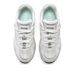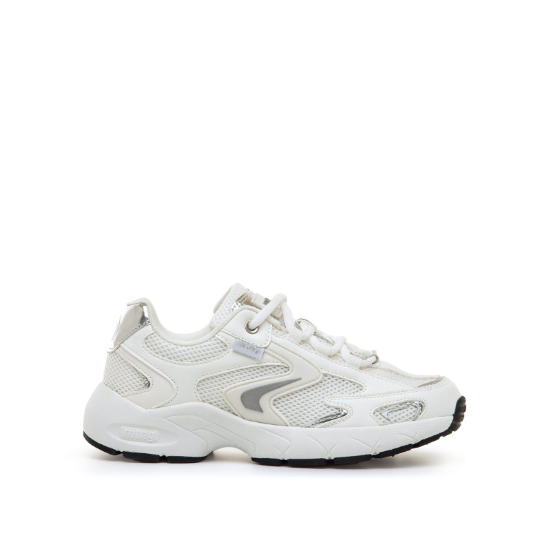Zapatillas deportivas blancas para mujer de la marca mtng, modelo Electra. Su diseño combina paneles de rejilla con piezas en acabado brillante de color plata que aportan un toque dinámico y actual. Incluye cierre con cordones y suela gruesa de estilo chunky con tecnología Extralight, lo que las hace más ligeras y cómodas para llevar durante horas. La parte trasera con talón metalizado refuerza su estética deportiva y sus plantillas con tecnología Starfit mejoran la comodidad en cada paso. Con certificado VEGANO sellado por INESCOP, el cual garantiza que la naturaleza química principal del material no se corresponde con fibras de origen animal.