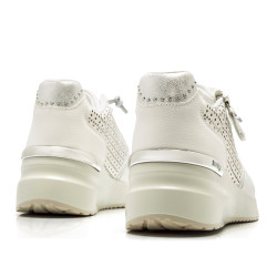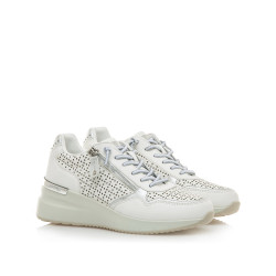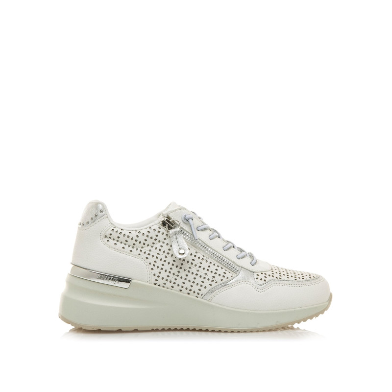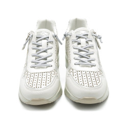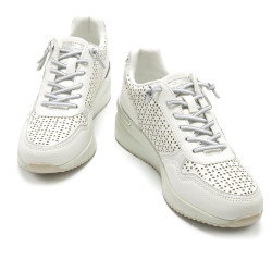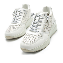 Zapatillas blancas de plataforma modelo Goa de Mtng, para mujer. Estas zapatillas destacan por su diseño con detalles perforados en los laterales. El cierre de cordones, junto con la cremallera lateral, facilita un ajuste rápido y cómodo. Su suela es de cuña, perfectas para combinar con looks casuales. ¡Encuentra la versatilidad en Goa de Mtng!