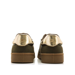 Zapatillas casual de color verde kaki para mujer de la marca MTNG, modelo Roy, con detalles en dorado metalizado. Presenta un diseño retro con puntera redondeada, suela en tono caramelo y paneles texturizados que combinan diferentes acabados. Los laterales llevan el logo bordado y franjas en contraste, aportando un estilo deportivo con toques actuales. Perfecta para el uso diario, combina comodidad y diseño para looks relajados con un punto original.
