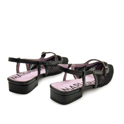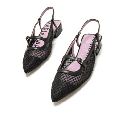 Zapatos negros planos para mujer de Mariamare, modelo Puglia. Este diseño destaca por su estructura destalonada y de malla que aporta un estilo moderno y fresco, combinado con detalles brillantes. La punta afilada y la correa ajustable en el empeine añaden un toque elegante y funcional, mientras que el tacón bajo asegura comodidad. Perfectos para elevar cualquier look.