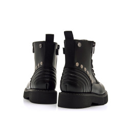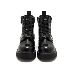 Botín de color negro para niña modelo Storm High de MTNG. Este diseño de estilo militar destaca por su estética urbana con toques decorativos en el lateral, incluyendo tachuelas metálicas que aportan personalidad y una cremallera frontal. El cierre con cremallera lateral y cordones permite un ajuste cómodo y rápido. La suela gruesa mejora la pisada y aporta mayor durabilidad, mientras que la pieza trasera moldeada refuerza la estructura y añade un acabado distintivo. Ideal para un look desenfadado con carácter.