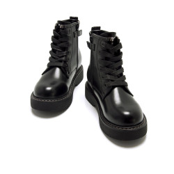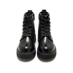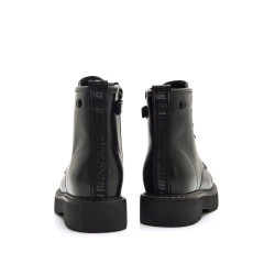 Botín de color negro para niña de MTNG modelo Storm High, estilo militar. Este diseño de caña media destaca por su estética robusta y urbana, ideal para looks informales con carácter. Incorpora cordones frontales y cremallera lateral que facilitan el ajuste, además de una trabilla trasera con el logo que aporta un toque distintivo. Su suela gruesa mejora la estabilidad y refuerza la comodidad en cada paso. Perfecto para niñas que buscan un calzado resistente y con estilo marcado.