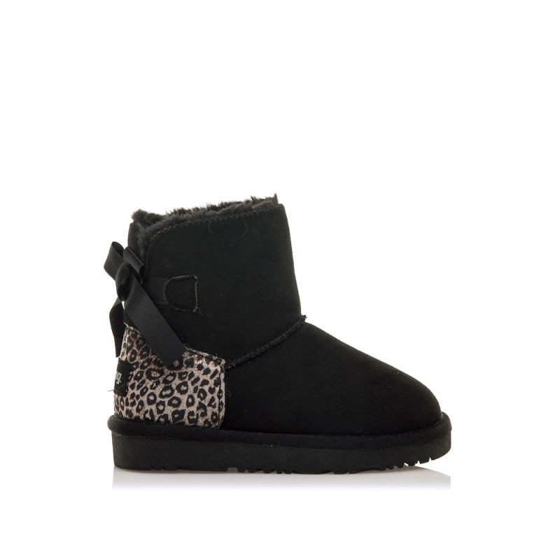 Botín de pelo para niña, modelo Sky de MTNG de color negro. Este botín apreski cuenta con refuerzo trasero en estampado animal print de leopardo que le da un toque atrevido y divertido. El interior forrado aporta calidez durante los meses más fríos, y el lazo decorativo en la parte trasera añade un extra de estilo. Su suela plana ofrece estabilidad y comodidad para un uso diario, perfecto tanto para el colegio como para paseos invernales.