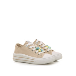 Zapatilla baja beige Bigger Z para niña y niño de Mtng. Esta zapatilla tiene personalidad y estilo, con detalles de cuentas y abalorios de colores en su cierre de cordones. Se equipa con una suela de goma de plataforma asimética que la diferencia del resto, ideales para el día a día. Fabricado con un 60% de algodón reciclado post consumo y un 40% de algodón convencional. ¡Destaca con Bigger Z de Mtng!