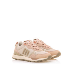 Zapatillas de color rosa para niña de la marca Mtng, modelo Compact. Este diseño combina diferentes tonos de beige, rosa empolvado y detalles metalizados en una silueta ligera y cómoda. Los detalles acolchados y el logo lateral aportan un toque distintivo sin perder funcionalidad, mientras que la suela en contraste proporciona buena estabilidad. Un modelo versátil que suma estilo a cualquier conjunto.