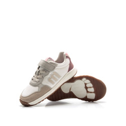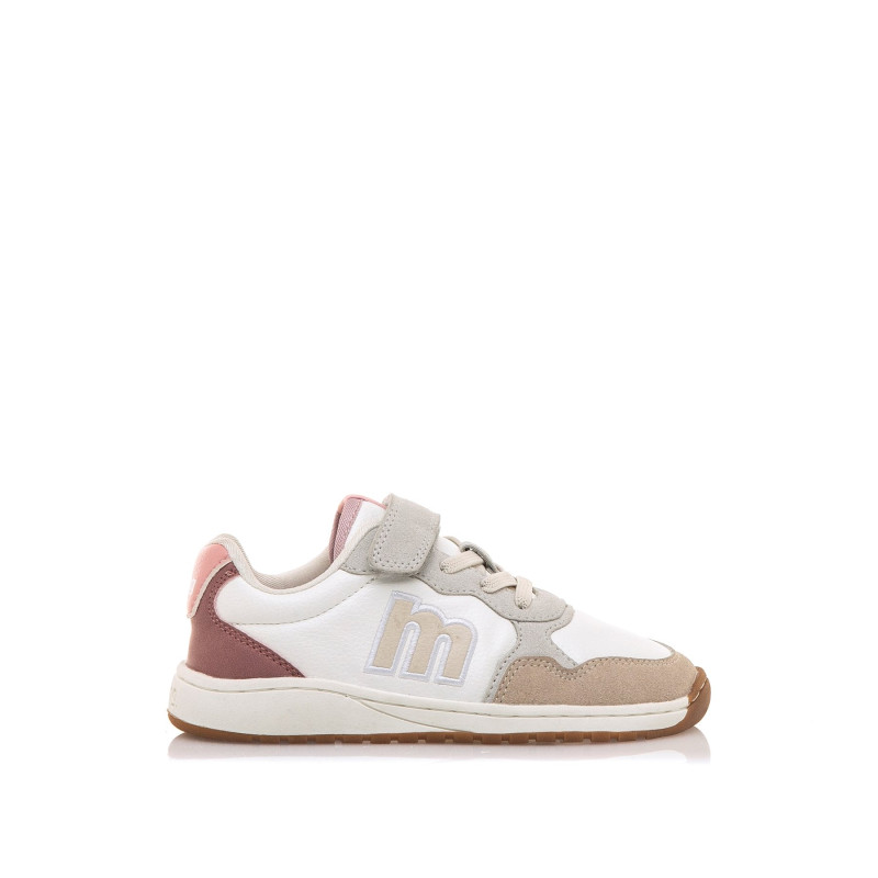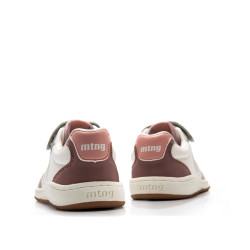 Zapatilla casual de color blanco para niña de la marca MTNG, modelo Free. Su diseño combina diferentes texturas: base lisa, refuerzos de serraje en gris, marrón y malva, y detalles rosas en el talón, creando un acabado suave. Incorpora cordones elásticos con tira adherente y suela con puntera reforzada. Diseñado y desarrollado especialmente en colaboración con el Dr. Juanjo López, traumatólogo deportivo e infantil, para respetar el desarrollo natural del pie del niño y la niña. Gracias a su puntera ancha permite el libre movimiento de los dedos dentro del zapato. Las plantillas extraíbles facilitan comprobar si la talla del calzado es la correcta para tu hijo. Además, su fácil apertura facilita que el niño pueda descalzarse y calzarse de forma autónoma. Con certificado VEGANO sellado por INESCOP, el cual garantiza que la naturaleza química principal del material no se corresponde con fibras de origen animal.