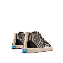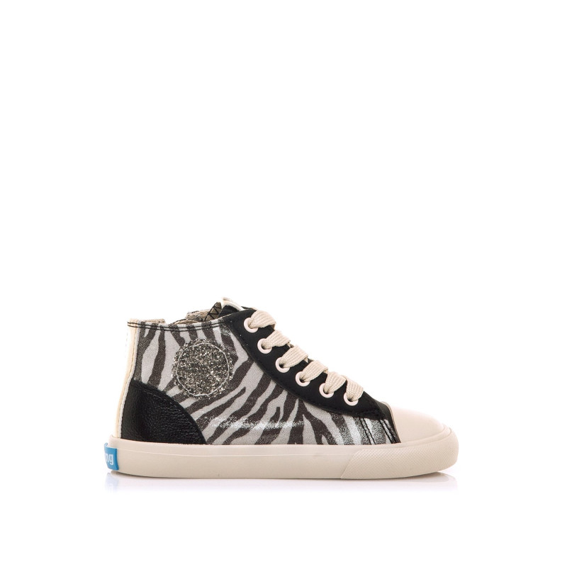 Zapatilla abotinada de color negro con estampado animal print de cebra para niña, modelo Free de MTNG. Con un diseño de caña media que combina estilo y funcionalidad, incorpora cordones anchos en tono crudo y cremallera lateral para facilitar el calce, así como un distintivo parche lateral de glitter en tono plata. Con certificado VEGANO sellado por INESCOP, el cual garantiza que la naturaleza química principal del material no se corresponde con fibras de origen animal. Diseñado y desarrollado especialmente en colaboración con el Dr. Juanjo López, traumatólogo deportivo e infantil, para respetar el desarrollo natural del pie del niño y la niña. Gracias a su puntera ancha permite el libre movimiento de los dedos dentro del zapato. Las plantillas extraíbles facilitan comprobar si la talla del calzado es la correcta para tu hijo. Además, su fácil apertura facilita que el niño pueda descalzarse y calzarse de forma autónoma.