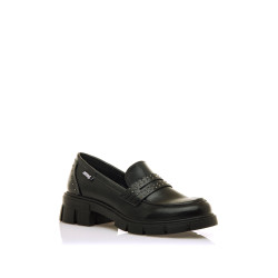 Mocasín de color negro para niña, modelo Mia de Mtng. Este zapato tipo oxford presenta una silueta robusta con suela gruesa dentada y detalles de mini tachuelas metálicas sobre la banda frontal y el talón, que le dan un toque actual y desenfadado. Su diseño tipo antifaz y acabado pulido lo convierten en una opción ideal para looks escolares o informales con un punto diferente.