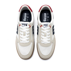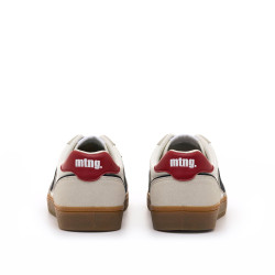 Zapatillas de estilo casual deportivo para hombre de la marca Mtng, modelo Napoli, de color blanco y gris. Este diseño destaca por su combinación de tonos claros con detalles en azul marino y un refuerzo trasero de color rojo, que le aporta un toque distintivo. La suela tipo goma en color caramelo y las plantillas con tecnología Starfit, mejoran la comodidad en cada paso. Incorporan cierre de cordones, logo lateral en contraste y panel de malla en la parte delantera. Con certificado VEGANO sellado por INESCOP, el cual garantiza que la naturaleza química principal del material no se corresponde con fibras de origen animal.