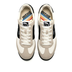 Zapatilla de color blanco con detalles en negro y beige para hombre de la marca mtng, modelo Olympic de estilo retro deportivo. Su diseño se inspira en el calzado clásico de running, con líneas suaves y combinación de texturas que aportan un look vintage actualizado. Cuenta con suela de goma dentada para mayor tracción, puntera reforzada y cierre de cordones. Incorporan una plantilla de 4 mm con tecnología Starfit, estas zapatillas ofrecen una pisada suave y cómoda. Su espuma Comfort Foam aporta un acolchado extra, ideal para disfrutar de un confort prolongado en cada uso.