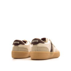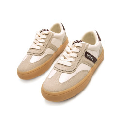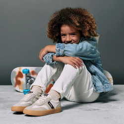 Zapatilla de estilo casual para niña de la marca MTNG, modelo Emi de color crudo. Diseñada con una suela tipo cupsole en color caramelo y combinaciones de textura en el corte que aportan un aire retro y versátil. El cierre con cordones permite un ajuste cómodo, mientras que los detalles en contraste burdeos con logo lateral y trasero refuerzan su identidad visual. Perfecta para el día a día, esta zapatilla es ideal para dar un toque desenfadado a looks urbanos o relajados.