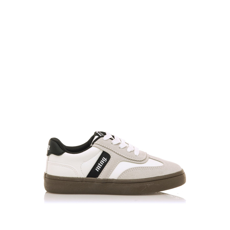Zapatillas de color blanco con detalles en negro y gris para niño, modelo Emi de Mtng, con cierre de cordones y suela de goma marrón. Estas zapatillas combinan un diseño moderno con materiales resistentes, ideales para el uso diario. Su suela de goma proporciona una buena tracción, mientras que los refuerzos en la puntera y laterales aseguran durabilidad. Perfectas para acompañar a los pequeños en sus actividades cotidianas con comodidad y estilo.