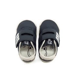 Zapatillas de color azul marino para bebé de la marca mtng modelo Free Baby. Su diseño lavable de estilo deportivo con cierre doble adhesivo facilita el ajuste. Destacan los detalles en blanco del talón, suela y la M del cierre. Diseñada y desarrollada especialmente en colaboración con el Dr. Juanjo López, traumatólogo deportivo e infantil, para respetar el desarrollo natural del pie de los niños. Gracias a su puntera ancha permite el libre movimiento de los dedos dentro del zapato. Su suela tiene 3 mm de grosor y con zero drop (totalmente plana) respeta el natural desarrollo del pie del pequeño y sus elementos flexibles y torsionables hace que el pie del niño no esté encorsetado por la estructura del zapato. Las plantillas extraíbles facilitan comprobar si la talla del calzado es la correcta para tu hijo. Además, su fácil apertura facilita que el niño pueda descalzarse y calzarse de forma autónoma. Acompaña los primeros pasos de tu bebé con mtng. Con certificado VEGANO sellado por INESCOP, el cual garantiza que la naturaleza química principal del material no se corresponde con fibras de origen animal.