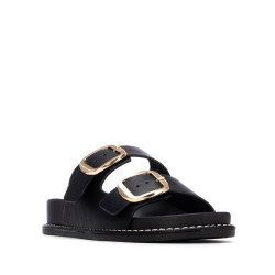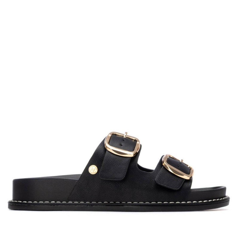 Sandalia de mujer, de la marca Xti Basic. Fabricada en material que imita la piel, con diseño de doble tira con hebillas que aseguran un ajuste perfecto. Es plana y cómoda, con una suela tipo bio que favorece una pisada natural y confortable. Ideal para un look casual con estilo y funcionalidad.