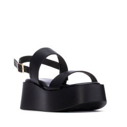 Sandalia de mujer, de la marca Refresh. Fabricada en material que imita a la piel. Modelo de dos palas paralelas con pulsera con hebilla para sujetar el tobillo. Plataforma de goma. Este modelo ha obtenido el certificado vegano por la organización mundial PETA (Organización de los derechos de los animales).