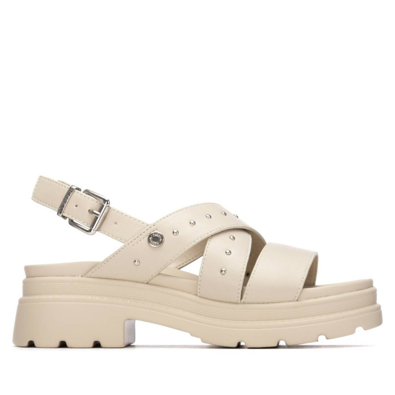 Sandalia de mujer, de la marca Refresh. Fabricada en material que imita a la piel. Tiras decoradas con tachuelas. Pulsera trasera con hebilla para ajustar al tobillo. Suela de goma. Este modelo ha obtenido el certificado vegano por la organización mundial PETA (Organización de los derechos de los animales).