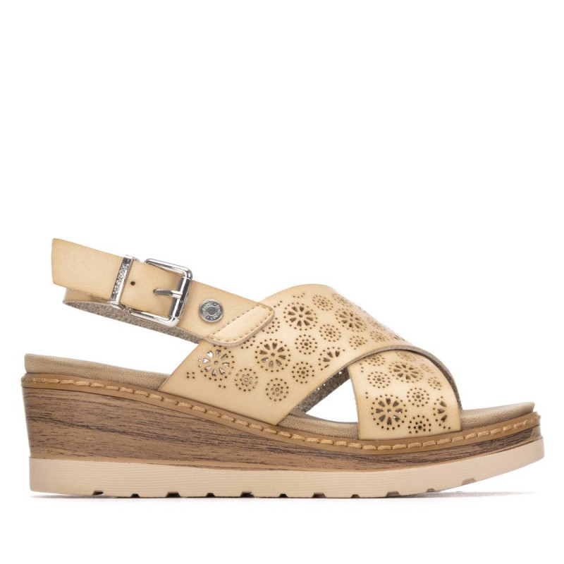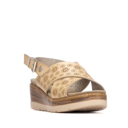 Sandalia de mujer, de la marca Refresh. Fabricada en material que imita a la piel. Su diseño de tiras cruzadas con detalles calados tipo láser le da un aire fresco y artesanal, ideal para esta temporada. La cuña de 6 cm con efecto madera aporta estilo y estabilidad a cada paso. Este modelo ha obtenido el certificado vegano por la organización mundial PETA (Organización de los derechos de los animales).