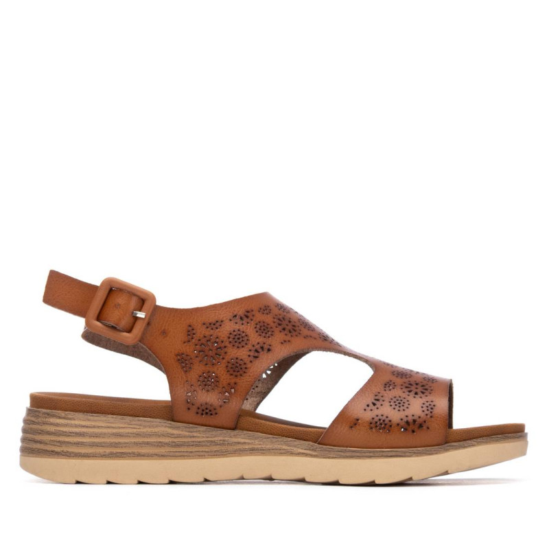 Sandalia de mujer, de la marca Refresh. Fabricada en material que imita la piel con troquel decorativo. Cierre mediante hebilla. Cómoda planta bio, con suela de goma canalada. Este modelo ha obtenido el certificado vegano por la organización mundial PETA (Organización de los derechos de los animales).