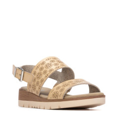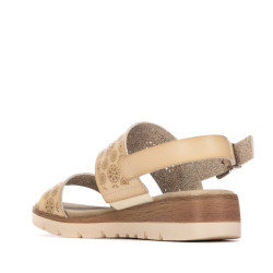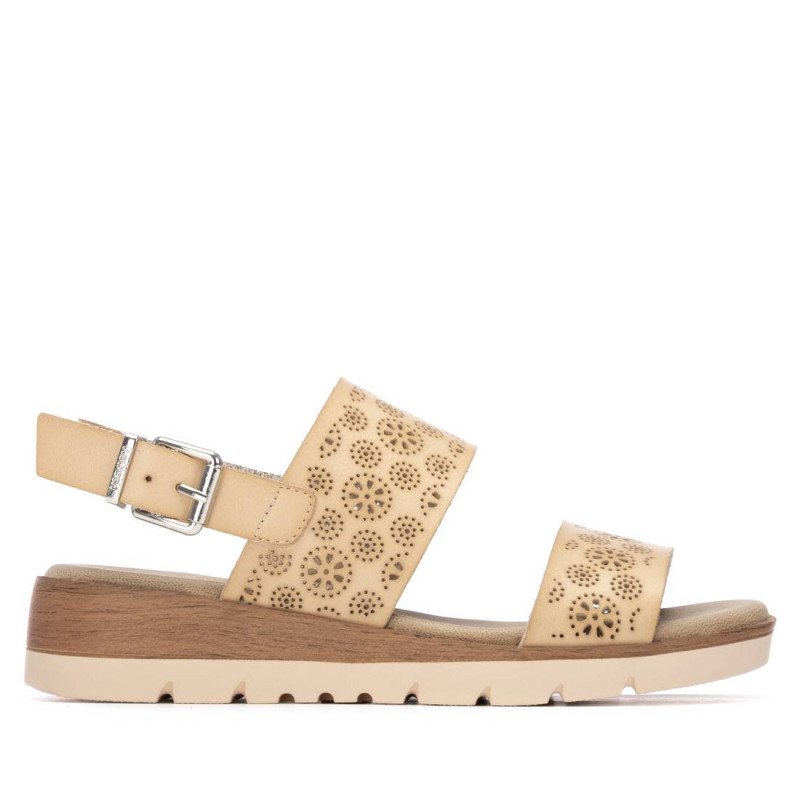 Sandalia de mujer, de la marca Refresh. Fabricada en material que imita la piel con troquel decorativo. Diseño de doble pala con pulsera trasera para sujetar al tobillo. Cómoda planta acolchada. Con cuña de 4 cm de altura. Este modelo ha obtenido el certificado vegano por la organización mundial PETA (Organización de los derechos de los animales).