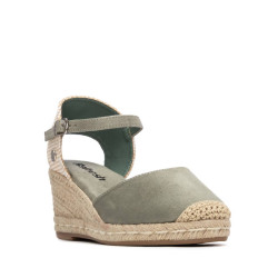 Zapato tipo alpargata de mujer, de la marca Refresh. Fabricado en suave antelina. Pulsera con hebilla metalizada. Cuña de yute con suela de goma. Este modelo ha obtenido el certificado vegano por la organización mundial PETA (Organización de los derechos de los animales).