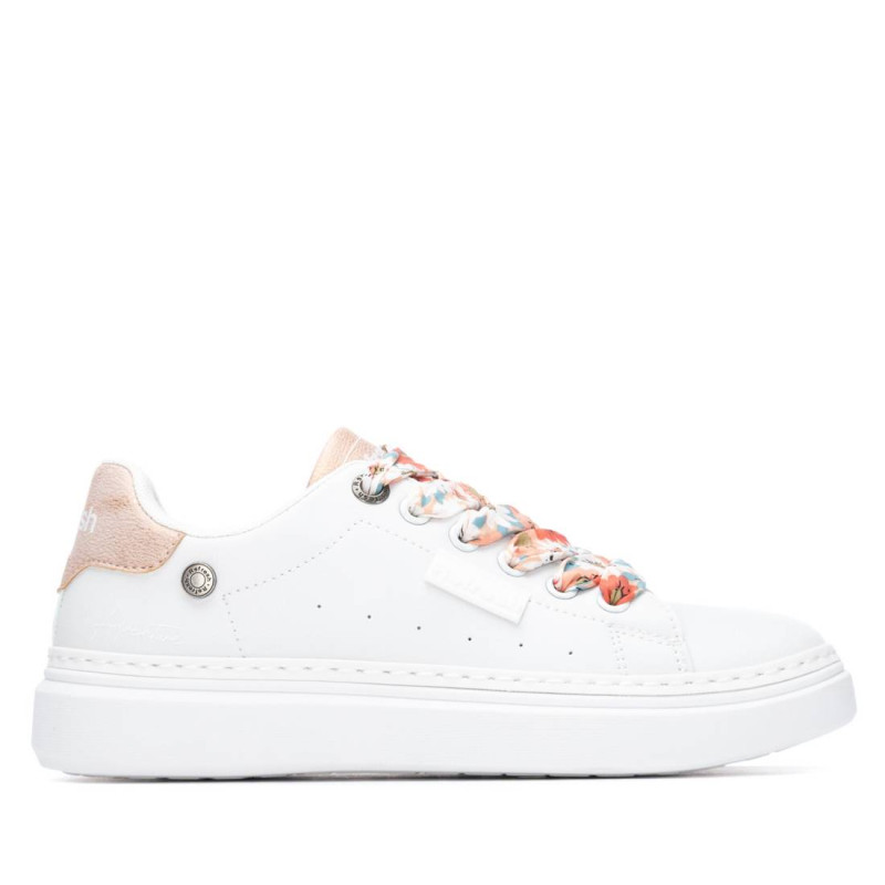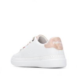 Zapatilla de mujer, de la marca Refresh. Fabricada en material que imita a la piel. Cordones gruesos con estampado. Gruesa suela de goma antideslizante. Este modelo ha obtenido el certificado vegano por la organización mundial PETA (Organización de los derechos de los animales).