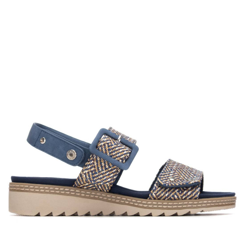 Sandalia de mujer, de la marca Refresh. Fabricado en material tipo rafia. Diseño de dos correas con cierre autoadherente con pulsera trasera regulable para ajustar el tobillo. Cómoda planta. Suela gruesa dentada de goma. Este modelo ha obtenido el certificado vegano por la organización mundial PETA (Organización de los derechos de los animales).