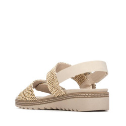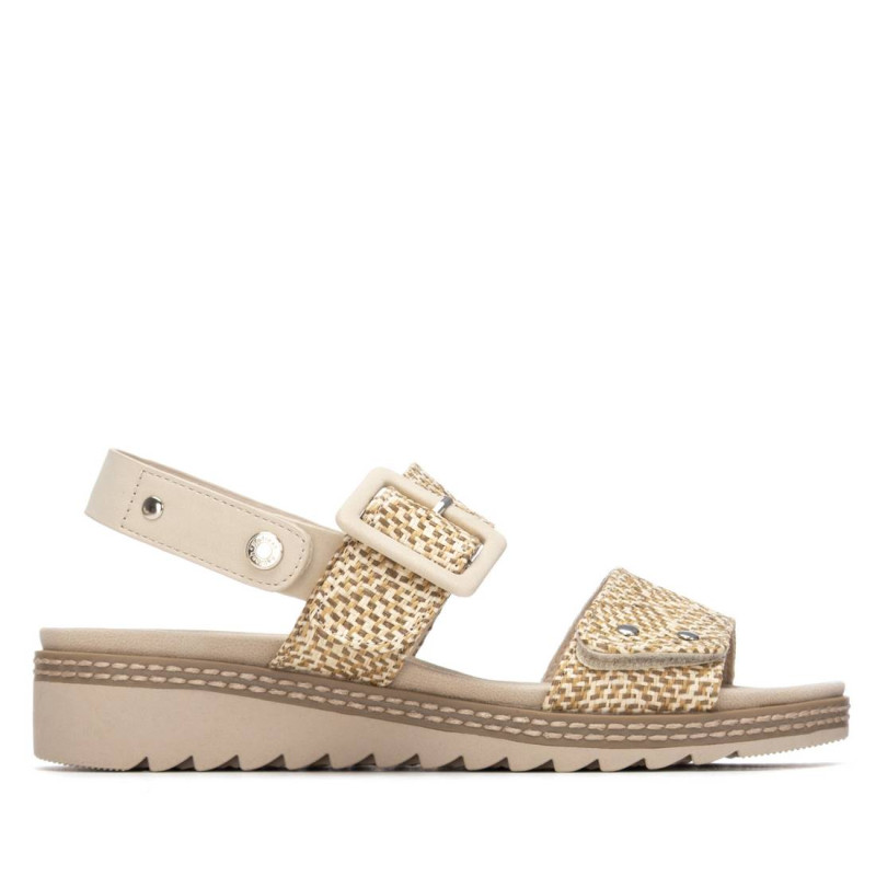 Sandalia de mujer, de la marca Refresh. Fabricado en material tipo rafia. Diseño de dos correas con cierre autoadherente con pulsera trasera regulable para ajustar el tobillo. Cómoda planta. Suela gruesa dentada de goma. Este modelo ha obtenido el certificado vegano por la organización mundial PETA (Organización de los derechos de los animales).