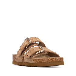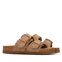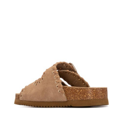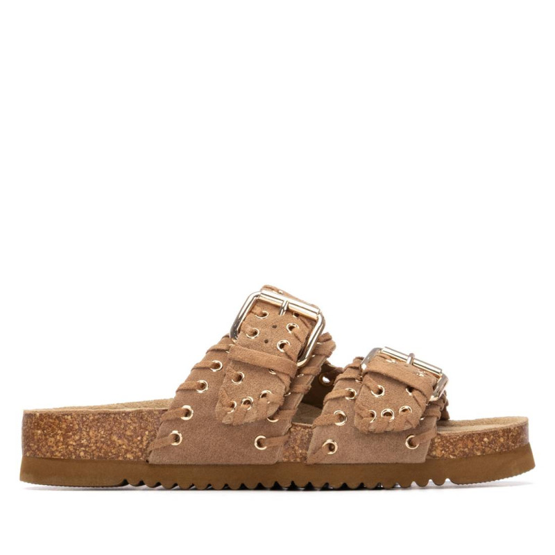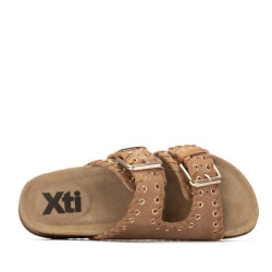 Sandalia de mujer, de la marca Xti. Fabricada en serraje, con diseño de doble tira con hebillas que proporciona un ajuste seguro y moderno. Destaca por una bonita decoración de pespuntes con ojales metálicos, que añade un toque original al conjunto. La suela tipo bio, plana y ergonómica, garantiza una pisada cómoda durante todo el día. Además, incorpora una base resistente que favorece una buena adherencia al caminar.