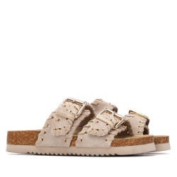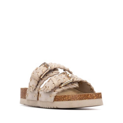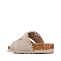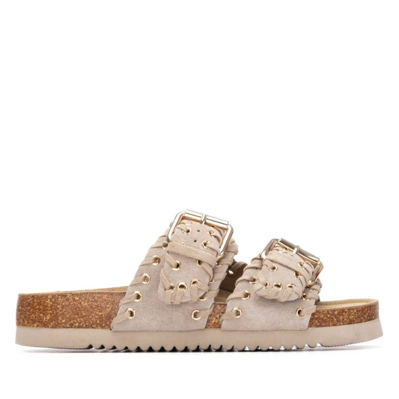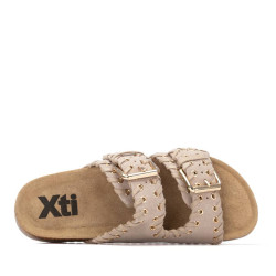 Sandalia de mujer, de la marca Xti. Fabricada en serraje, con diseño de doble tira con hebillas que proporciona un ajuste seguro y moderno. Destaca por una bonita decoración de pespuntes con ojales metálicos, que añade un toque original al conjunto. La suela tipo bio, plana y ergonómica, garantiza una pisada cómoda durante todo el día. Además, incorpora una base resistente que favorece una buena adherencia al caminar.