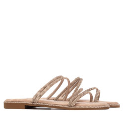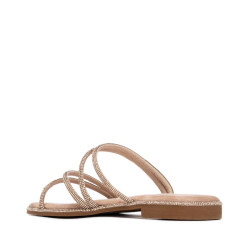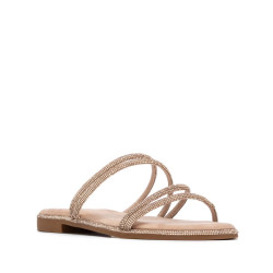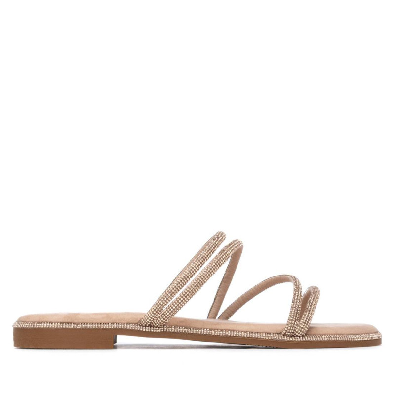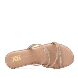 Zapato de mujer, de la marca Xti. Sandalia plana fabricada en material antelina, con un diseño de tiras finas decoradas con piedras brillantes al tono, que aportan un toque delicado y femenino. De calce fácil y cómodo, es ideal para looks veraniegos con un punto sofisticado. Cuenta con suela antideslizante, para mayor seguridad en cada paso. Este modelo ha obtenido el certificado vegano por la organización mundial PETA (Organización de los derechos de los animales).