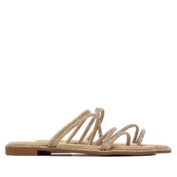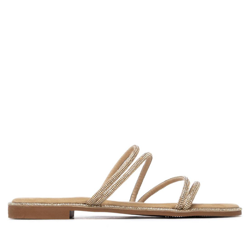 Zapato de mujer, de la marca Xti. Sandalia plana fabricada en material antelina, con un diseño de tiras finas decoradas con piedras brillantes al tono, que aportan un toque delicado y femenino. De calce fácil y cómodo, es ideal para looks veraniegos con un punto sofisticado. Cuenta con suela antideslizante, para mayor seguridad en cada paso. Este modelo ha obtenido el certificado vegano por la organización mundial PETA (Organización de los derechos de los animales).