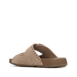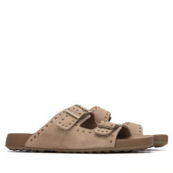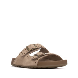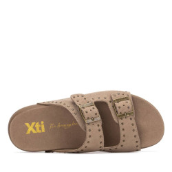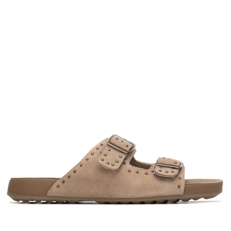 Sandalia de mujer, de la marca Xti. Fabricada en serraje, con diseño de doble tira con hebillas que ofrecen un ajuste seguro y personalizado. Presenta un detalle de tachuelas decorativas que aportan un toque moderno y atrevido. Cuenta con una suela cómoda y flexible tipo bio, ideal para largas jornadas con confort y estabilidad. Perfecta para un look casual con estilo.