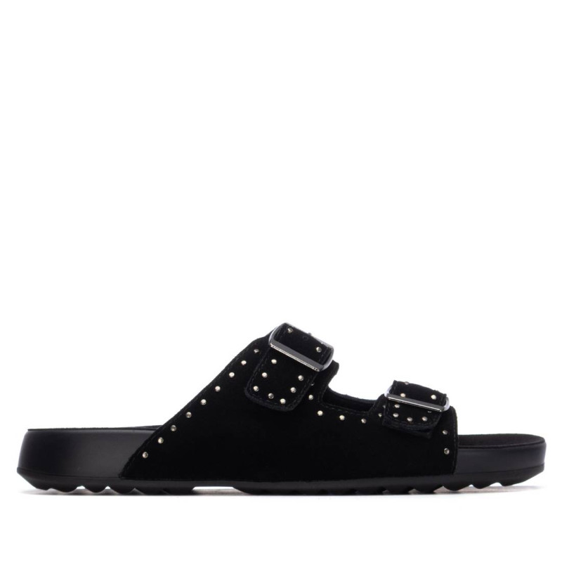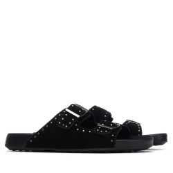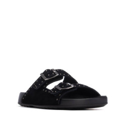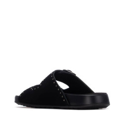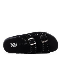 Sandalia de mujer, de la marca Xti. Fabricada en serraje, con diseño de doble tira con hebillas que ofrecen un ajuste seguro y personalizado. Presenta un detalle de tachuelas decorativas que aportan un toque moderno y atrevido. Cuenta con una suela cómoda y flexible tipo bio, ideal para largas jornadas con confort y estabilidad. Perfecta para un look casual con estilo.