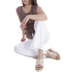 Sandalia de mujer, de la marca Xti. Fabricada en textil trenzado con efecto metalizado, esta sandalia destaca por su moderno diseño de tiras cruzadas, que aporta un toque elegante y actual. Cuenta con una cuña con acabado efecto madera, que combina estilo y comodidad, perfecta para completar tus looks veraniegos con un aire sofisticado y natural. Ideal para quienes buscan un calzado versátil y con personalidad para disfrutar del buen tiempo. Este modelo ha obtenido el certificado vegano por la organización mundial PETA (Organización de los derechos de los animales).