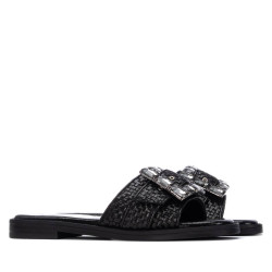 Sandalia de mujer, de la marca Xti. Fabricada en textil con efecto metalizado, este modelo destalonado destaca por su diseño de pala amplia adornada con una bonita hebilla grande con brillantes, que aporta un toque sofisticado y llamativo. Cuenta con un tacón bajo de 2 cm, ideal para combinar estilo y comodidad en tus looks de temporada. Perfecta para ocasiones especiales y salidas diurnas, aportando un brillo sutil y moderno. Este modelo ha obtenido el certificado vegano por la organización mundial PETA (Organización de los derechos de los animales).