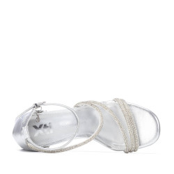 Sandalia de mujer, de la marca Xti. Fabricada en material con acabado metalizado, este elegante modelo presenta un diseño de finas tiras decoradas con strass al tono, que aportan brillo y sofisticación al conjunto. Cuenta con un tacón de 6 cm que estiliza la figura sin renunciar a la comodidad. Una sandalia ideal para ocasiones especiales o para dar un toque distinguido a tus looks veraniegos. Este modelo ha obtenido el certificado vegano por la organización mundial PETA (Organización de los derechos de los animales).