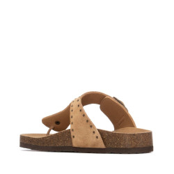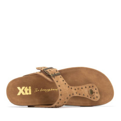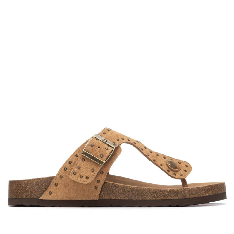 Sandalia de mujer, de la marca Xti. Fabricada en serraje, esta sandalia plana presenta un diseño actual y cómodo, con suela tipo bio que aporta confort en cada pisada. El modelo cuenta con una tira frontal que se coloca entre los dedos, ofreciendo una sujeción diferente y original. Decorada con bonitas tachas metálicas que le dan un toque moderno y desenfadado. Incluye hebilla lateral para un ajuste personalizado. Perfecta para completar looks veraniegos con estilo y comodidad.