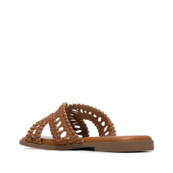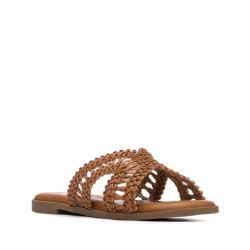 Sandalia de mujer, fabricada en material tipo rafia, con un delicado y atractivo diseño entrelazado. Modelo de pala destalonado y plano, que combina estilo y frescura para los días de calor. Perfecta para looks casuales y cómodos, ideal para quienes buscan un calzado ligero y con un toque natural y veraniego. Este modelo ha obtenido el certificado vegano por la organización mundial PETA (Organización de los derechos de los animales).