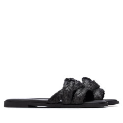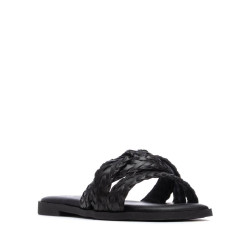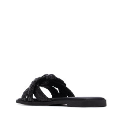 Sandalia de mujer, fabricada en material que imita la piel, con un elegante diseño entrelazado que se refleja tanto en la estructura del modelo como en la textura del material. Modelo de pala, plano y cómodo, ideal para quienes buscan un calzado versátil y sofisticado para el día a día, aportando un toque delicado y natural a cualquier look. Este modelo ha obtenido el certificado vegano por la organización mundial PETA (Organización de los derechos de los animales).