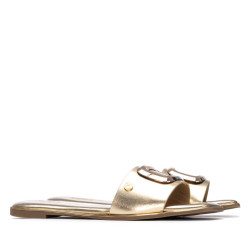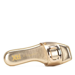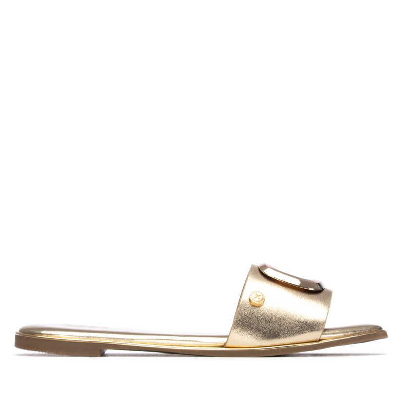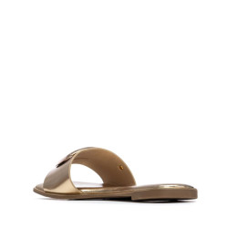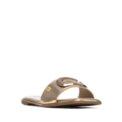 Sandalia plana de mujer, fabricada en material que imita la piel, ideal para un look cómodo y moderno. Modelo de pala ancha y diseño destalonado que facilita la frescura y libertad al pie. Destaca por sus detalles metálicos en el empeine, que aportan un toque sofisticado, y un elegante acabado metálico que recorre el contorno de la suela, realzando el diseño con estilo. Perfecta para el buen tiempo y para combinar con looks casuales y urbanos.