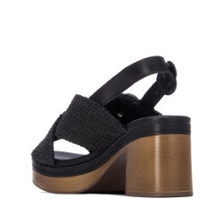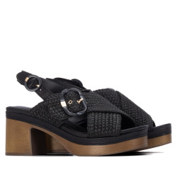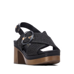 Sandalia de mujer, marca Carmela. Fabricada en material tipo rafia con diseño trenzado con adorne frontal para una mayor elegancia. Modelo de pala cruzada y cierre mediante correa al tobillo con hebilla. Cómoda planta y tacón ancho de 8 cm. Suela antideslizante.