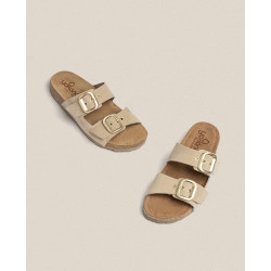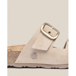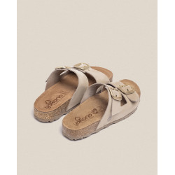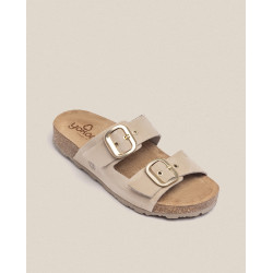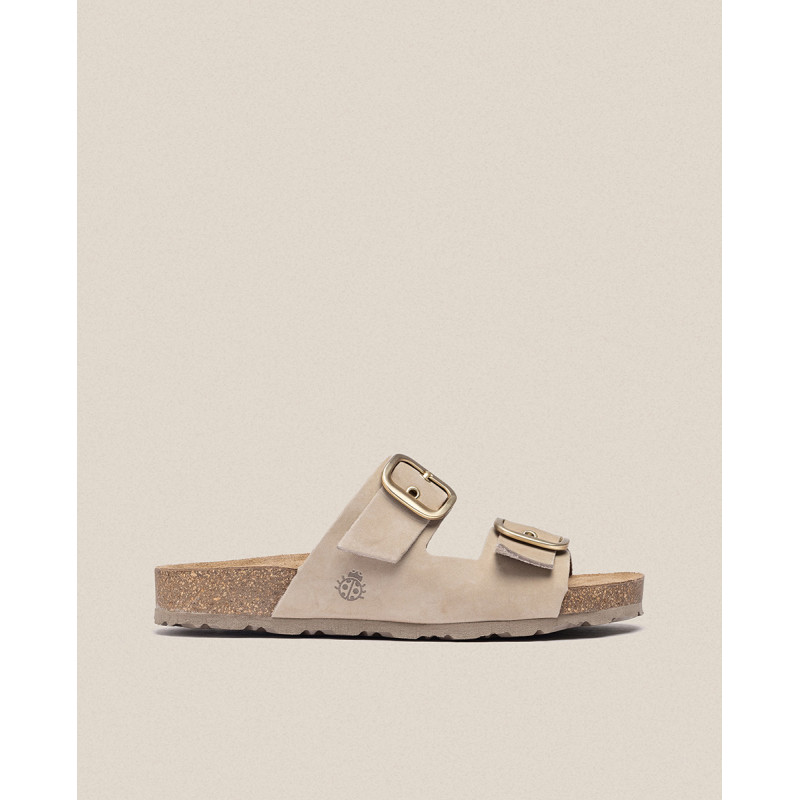 La sandalia plana JERBA 136 en beige, con dos tiras que cubren el empeine y dos hebillas doradas para que se ajuste con facilidad. Cuenta con una suela de 3 cm y una plantilla antideslizante que garantiza el agarre del pie. Está elaborada de manera artesanal en España, material de piel y uso de tintes vegetales respetuosos con el medio ambiente.