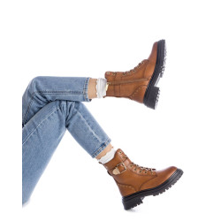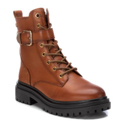 Botín de mujer, de la marca Carmela. Fabricado en piel de alta calidad. Con cierre cremallera en el lateral y cordones ajustables. Hebillas decorativas metalizadas. Suela gruesa antideslizante.