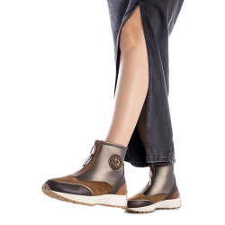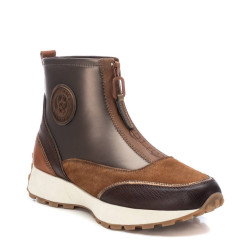 Botín de mujer, de la marca Carmela. Fabricado en piel de alta calidad combinada con otros materiales. Cierre mediante cremallera frontal. Tirador trasero para facilitar la puesta. Con plantilla extraíble.
