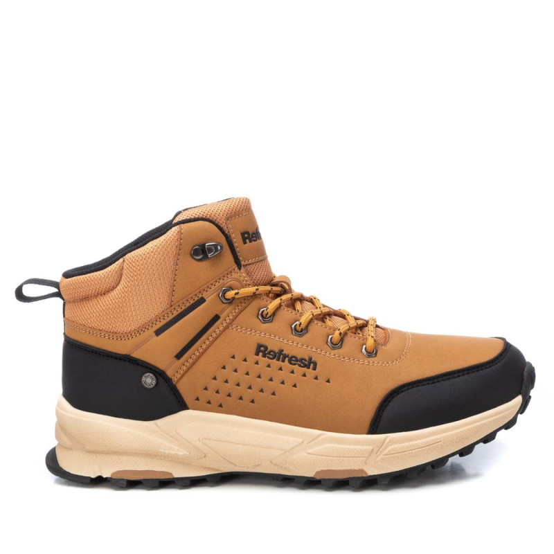 Botín de hombre, de la marca Refresh. Fabricado en un material que imita la piel. Cierre mediante cremallera lateral y cordones ajustables. Tirador trasero para facilitar la puesta. Modelo estilo montañero. Suela gruesa de goma antideslizante. Con plantilla extraíble. Este modelo ha obtenido el certificado vegano por la organización mundial PETA (Organización de los derechos de los animales).