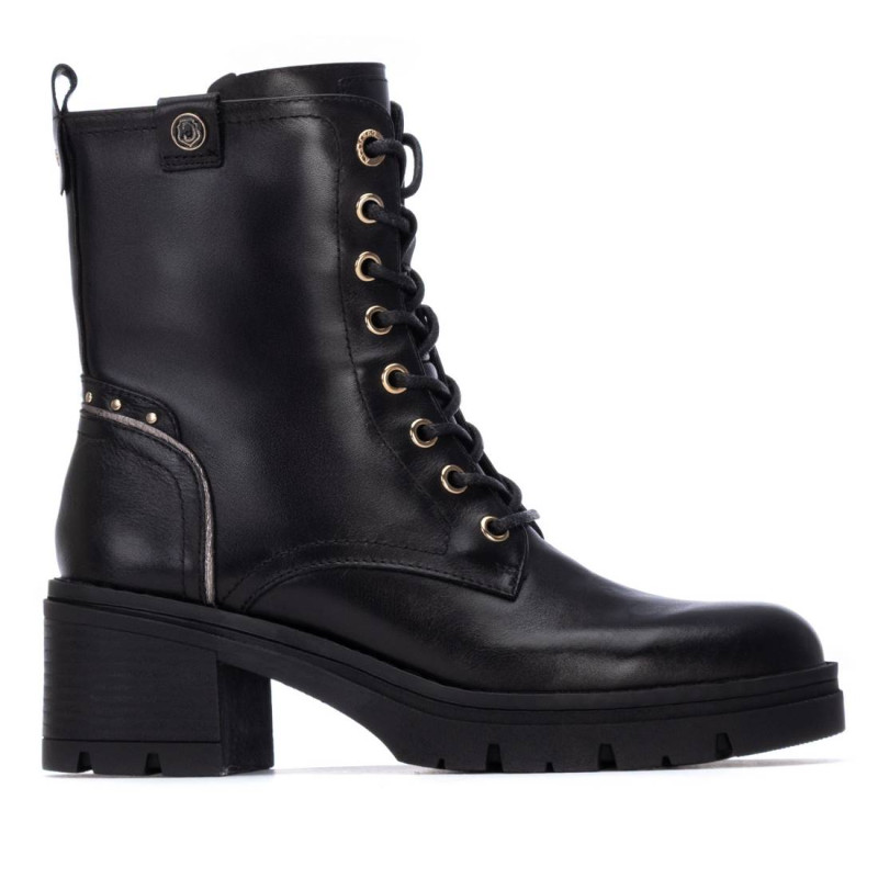 Botín de mujer, de la marca Carmela. Fabricado en piel de alta calidad. Tirador trasero para facilitar la puesta. Cordones ajustables. Detalle trasero con tachuelas pequeñas. Suela antideslizante.