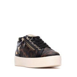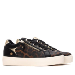 Zapatilla de mujer de la marca Xti, fabricada en material que imita la piel, con estampado de imitación leopardo en el lateral que le da un toque audaz y moderno. Cuenta con cremallera lateral para un ajuste fácil y detalles dorados que aportan un toque sofisticado. Su suela plana antideslizante garantiza comodidad y estabilidad, perfecta para un look casual y estilizado. Con plantilla extraíble. Este modelo ha obtenido el certificado vegano por la organización mundial PETA (Organización de los derechos de los animales).